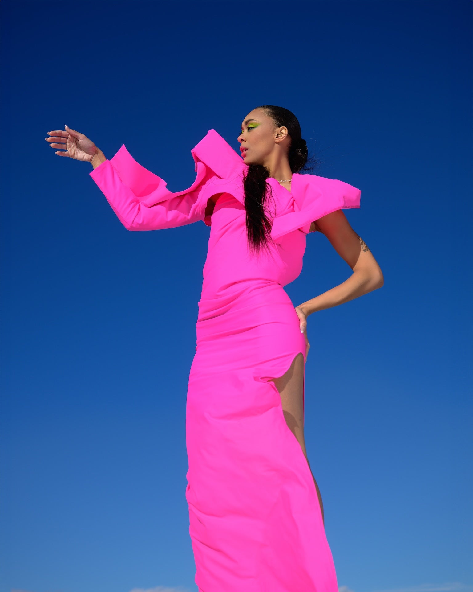 This asymmetric pink dress features a stylish slit, open back, and an attached cowl neck hood, blending contemporary design with comfort. Crafted for a flattering fit, its unique cut offers both elegance and an edgy look, ideal for standout occasions. The hood adds a modern, versatile touch to this refined piece.
