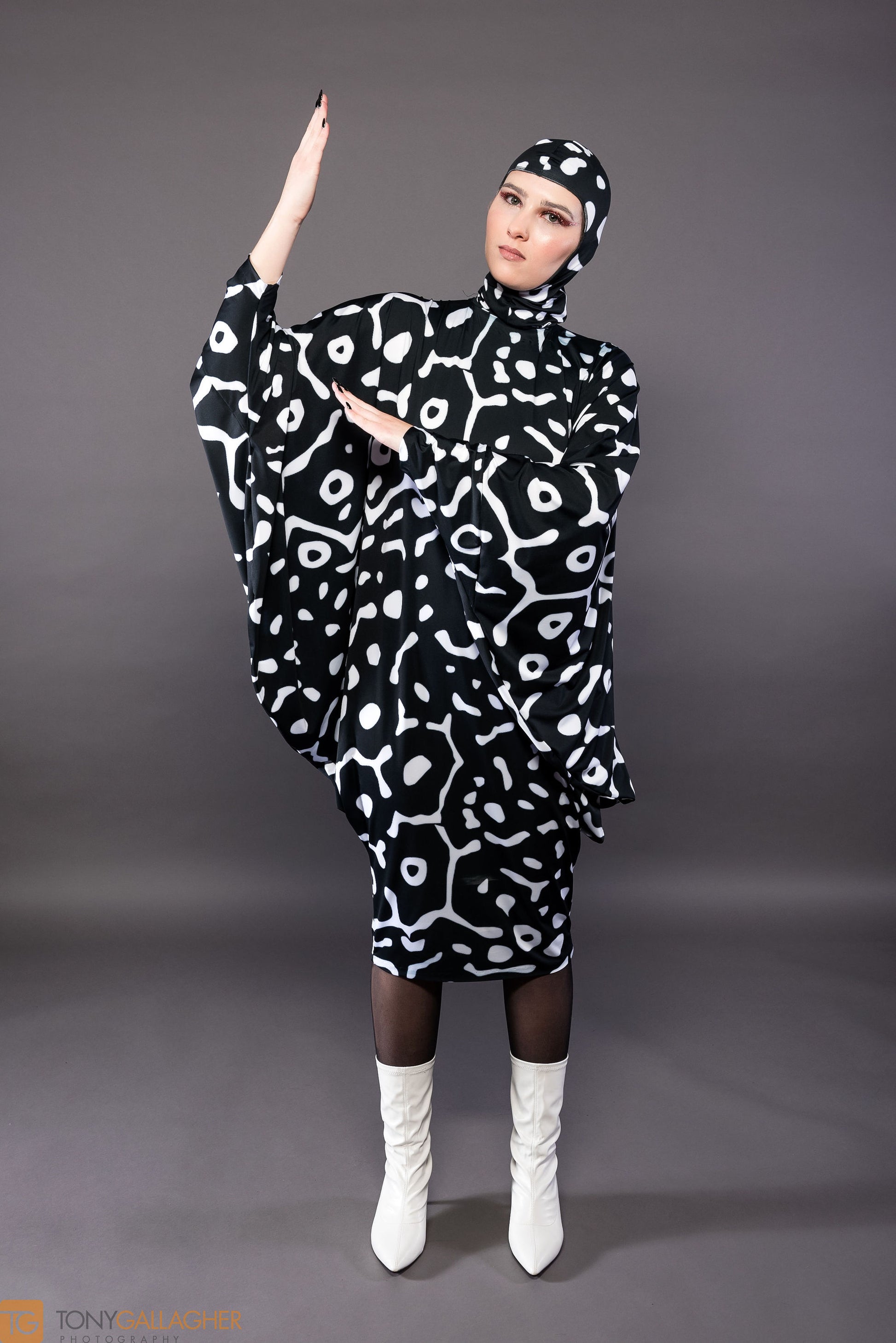 Original print. Hood to cover head is included and is detached from the dress. Hood may be worn separately.