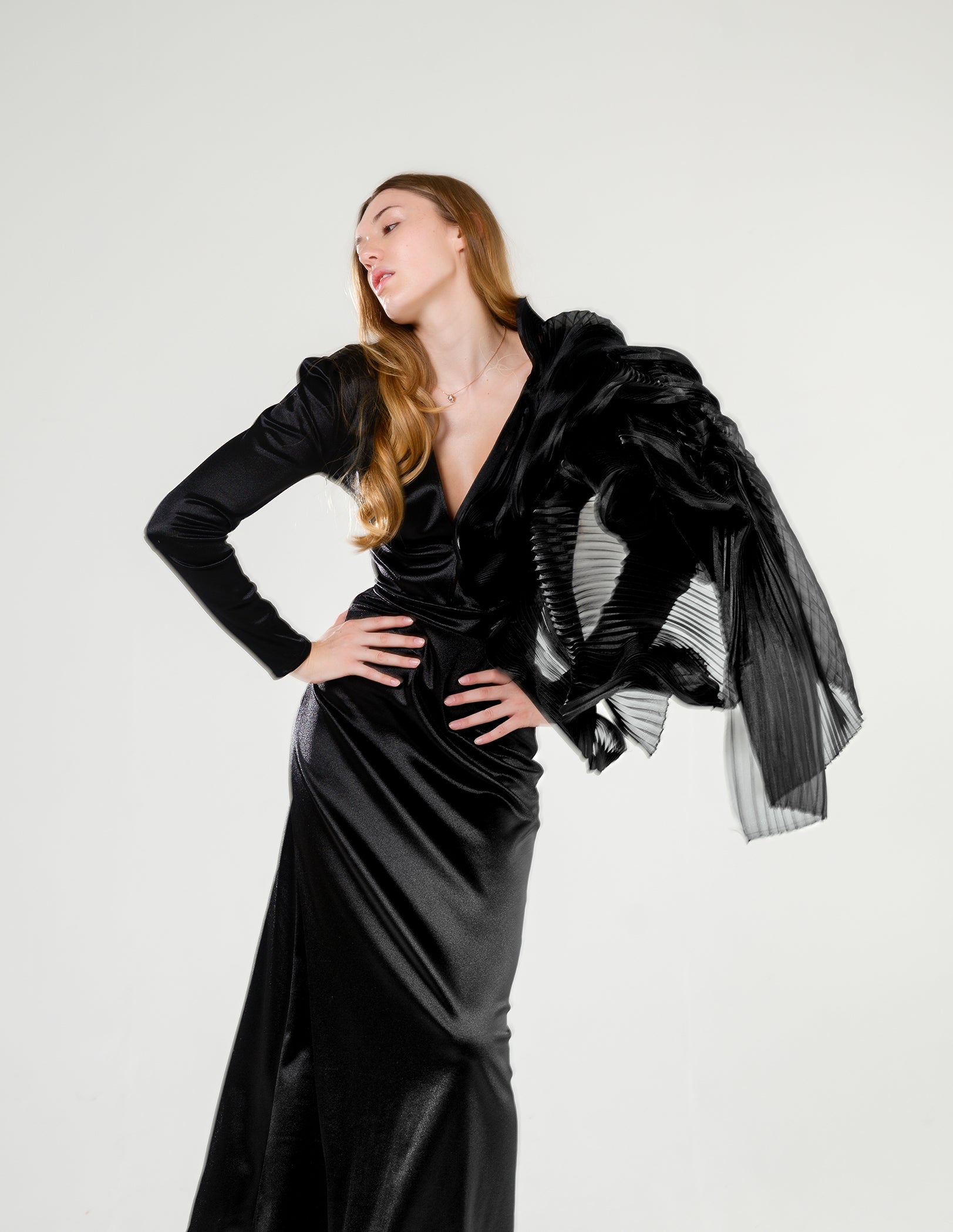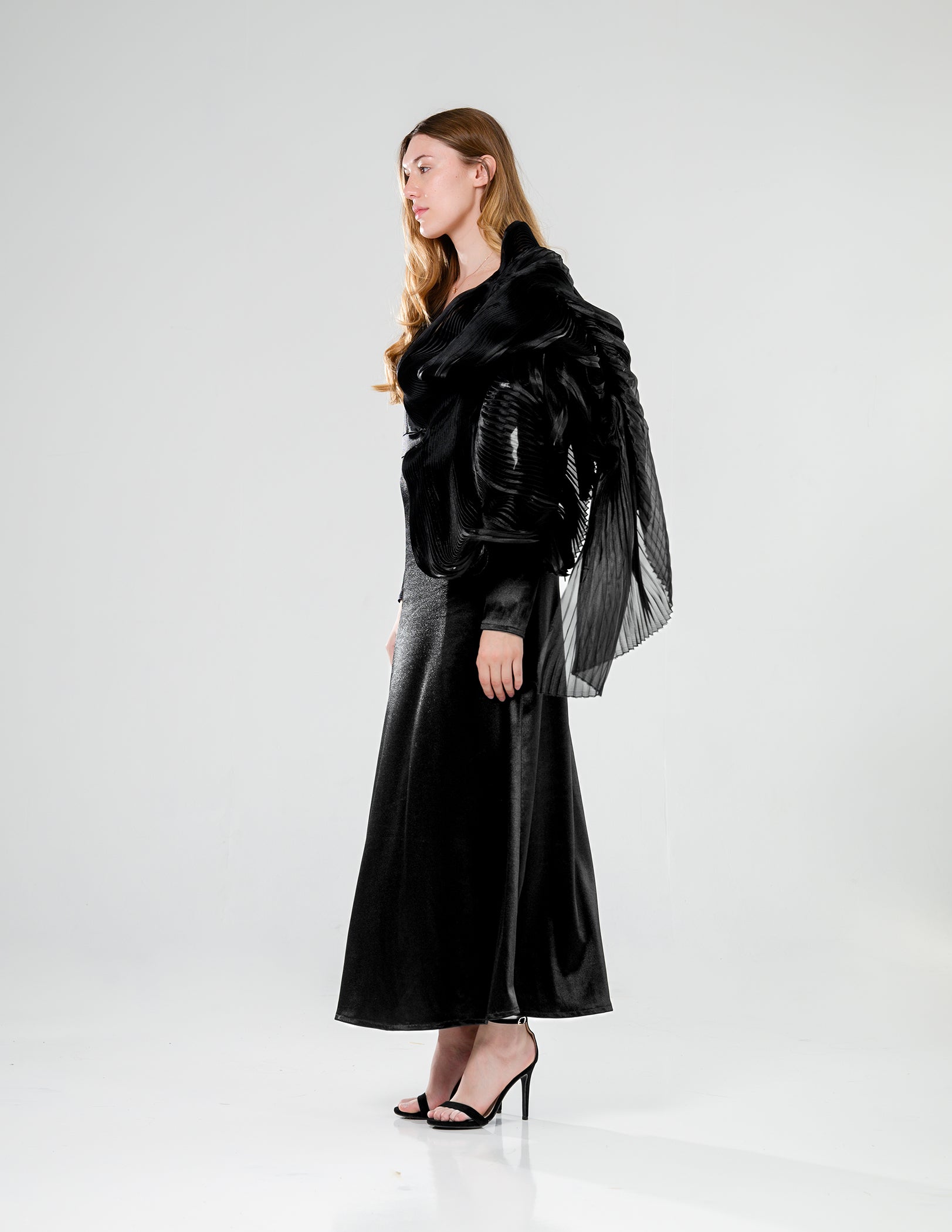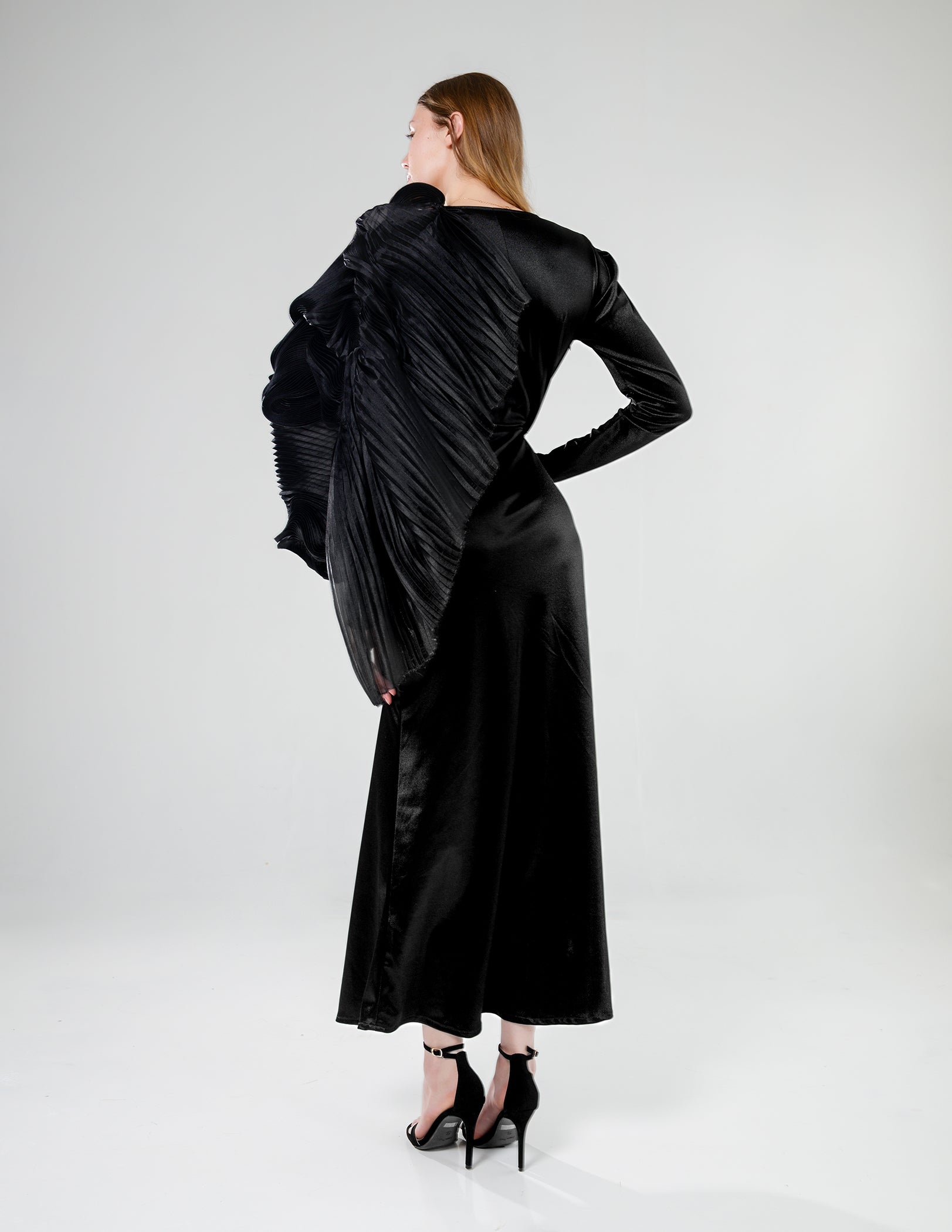This sophisticated black maxi dress offers a modern and avant-garde silhouette perfect for a formal event. The dress features a smooth, satin-like fabric with a simple, high neckline and long sleeves. A dramatic pleated detail (detachable) on one shoulder cascades down the back, creating a striking and unique profile. The dress is a sleek and elegant choice, designed to be a standout piece on its own. It's ideal for a black-tie event, gala, or any special occasion where you want to make a refined and stylish impression.